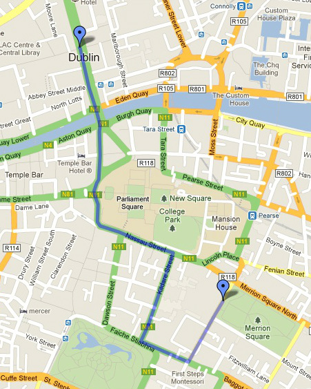 Looking at Google Maps, it seems Kildare Street is about a thousand feet long, so let’s assume my friend was right – allowing for slight exaggeration – and that the march occupied more than three quarters of the street. 800 feet of marchers, so, on a street about 30 feet wide.  This would probably provide room for 960 Roman soldiers, give or take; more could have been fitted in, but only in a very packed formation. I could do the sums, but it’d take us off topic by some way.