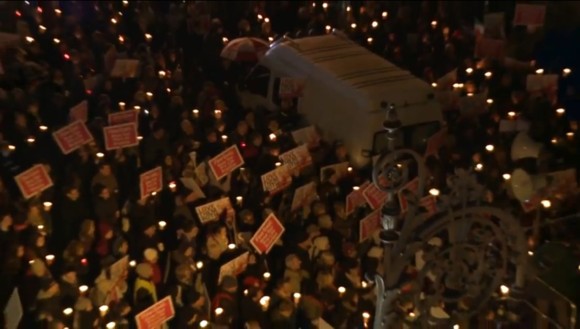 Anyway, these last couple of screenshots from the video with higher resolution don’t merely give us an indication that the crowd density was high throughout. They also reveal that there were far more people at the vigil without candles than there were with candles. Seriously, try counting them. Take other screenshots from the Youth Defence video if you like, and if you can find good enough shots. You’ll find the same pattern across the vigil.